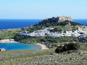 The ancient town of Lindos located on the east coast of Rhodes island at a distance of 50 km / 32 miles from the Rhodes Town. A number of 15th century structures within the whitewashed town are declared traditional buildings to be preserved. The climb to the acropolis is rewarded with spectacular views. Daily, tourists and Greeks take excursions to admire this village and its acropolis, and swim at its marvelous beaches. Per Homer, Lindos was built by the Dorians at the identical time as Kameiros and Ialyssos in the 12th century B.C. Rhodes sent nine ships to the Trojan War and most likely all of them came from Lindos. This fact shows that in that period Lindos was the most powerful town in Rhodes. The development of the town was due to its naval power. Its two harbors as well as its impregnable acropolis were unique on Rhodes.