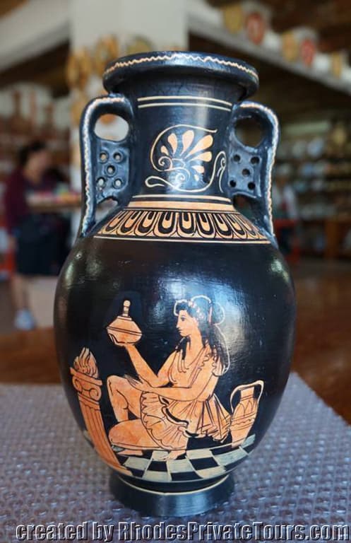 Pottery was produced by the Greeks from early period. It represents an important record and source of analysis for understanding vary historical periods of the Greek ancient life. Rhodes Island is known for its tradition in pottery and ceramics, and there are documents stating that clay bricks from the island of Rhodes were used in construction of the dome of “Agia Sofia” Byzantine church in Constantinople . Pottery is the most common artifact found on ancient archaeological sites and fine examples of local work can be seen in the Rhodes Archaeological Museum. Ceramics and pottery was used by the ancient Greeks in much the same way we use modern kitchen containers or plastic and of course played an important role in every aspect of Greek ancient life such as sports, banquets, weddings and funerals.