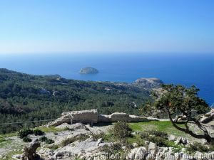 The view from the top is breath-taking. The Castle is on the top of the high rock, at the edge of the cliffs, so the views are fantastic! You will see Pine-tree forests far below you and the islands of Halki and Alimia off the western coast in the cool waters of the turquoise blue Aegean Sea.
