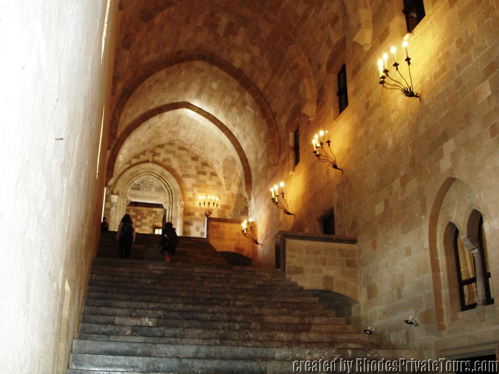 It had very imposing dimensions (80 x 75 meters - 262 x 240 foot) and defensive fortifications. It was so strong that during the siege of 1522 it suffered little damage. The main entrance is in the south facade, flanked by two imposing towers. The west facade is pierced by a gate, in front of which rises a tall, square tower, probably the work of the Grand Master Pierre d’Aubusson (1476-1503). On the site where the palace stands “Castello” the “Lower Acropolis” of ancient Rhodes once stood. This is also where the acropolis of the Rhodians of the Byzantine period stood (7th century).